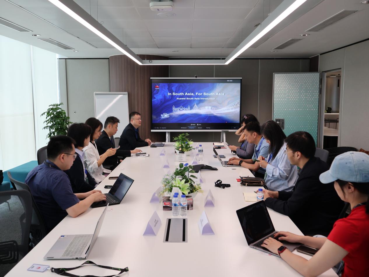 8月14日上午,调研团访问华为南亚代表处。副总裁林海为调研团一行介绍了华为在南亚地区的发展战略与成果。华为南亚员工本地化率超85%,并与300多家合作伙伴及孟加拉国达卡大学等高校开展合作,包括ICT学院、技术课程培训等。宁琦表示,调研团通过实地走访不同国家的华为代表处,尽管面临的政策环境、文化生态等各不相同,但华为展现出的适应能力和创新精神令人印象深刻,是名副其实的“中国的名片”。